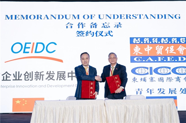 图:东方企业创新发展中心姜洪成主任与RCEP产业合作委员会柬埔寨执行主席毛信勤签署合作备忘录。