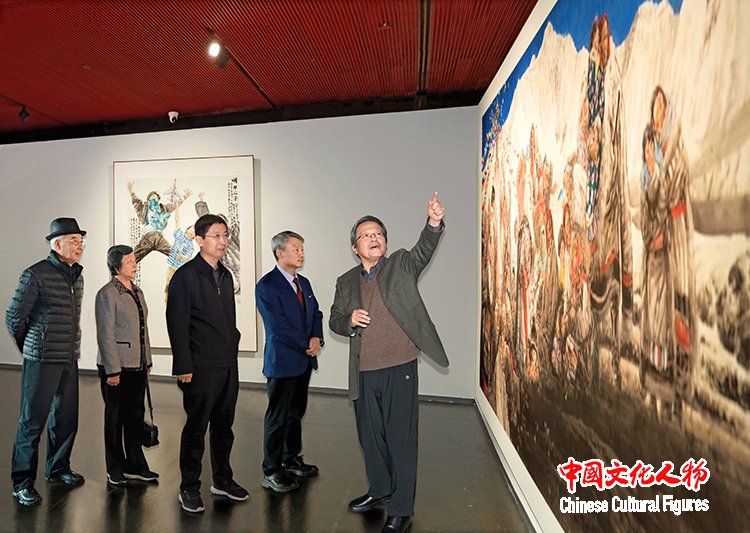 冯远为第十一届全国人大常委会副委员长华建敏、第十一届全国政协副主席孙家正、第十三届全国政协副主席马飚等参观展览的领导及艺术家嘉宾介绍展览作品