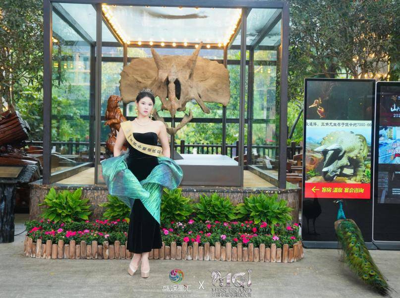 时光落笔,古今同框。佳丽选手身着华丽雅致的服饰,静立于三角龙化石之前,身姿的灵动与化石的厚重悄然相撞,温柔与苍劲共生相依。